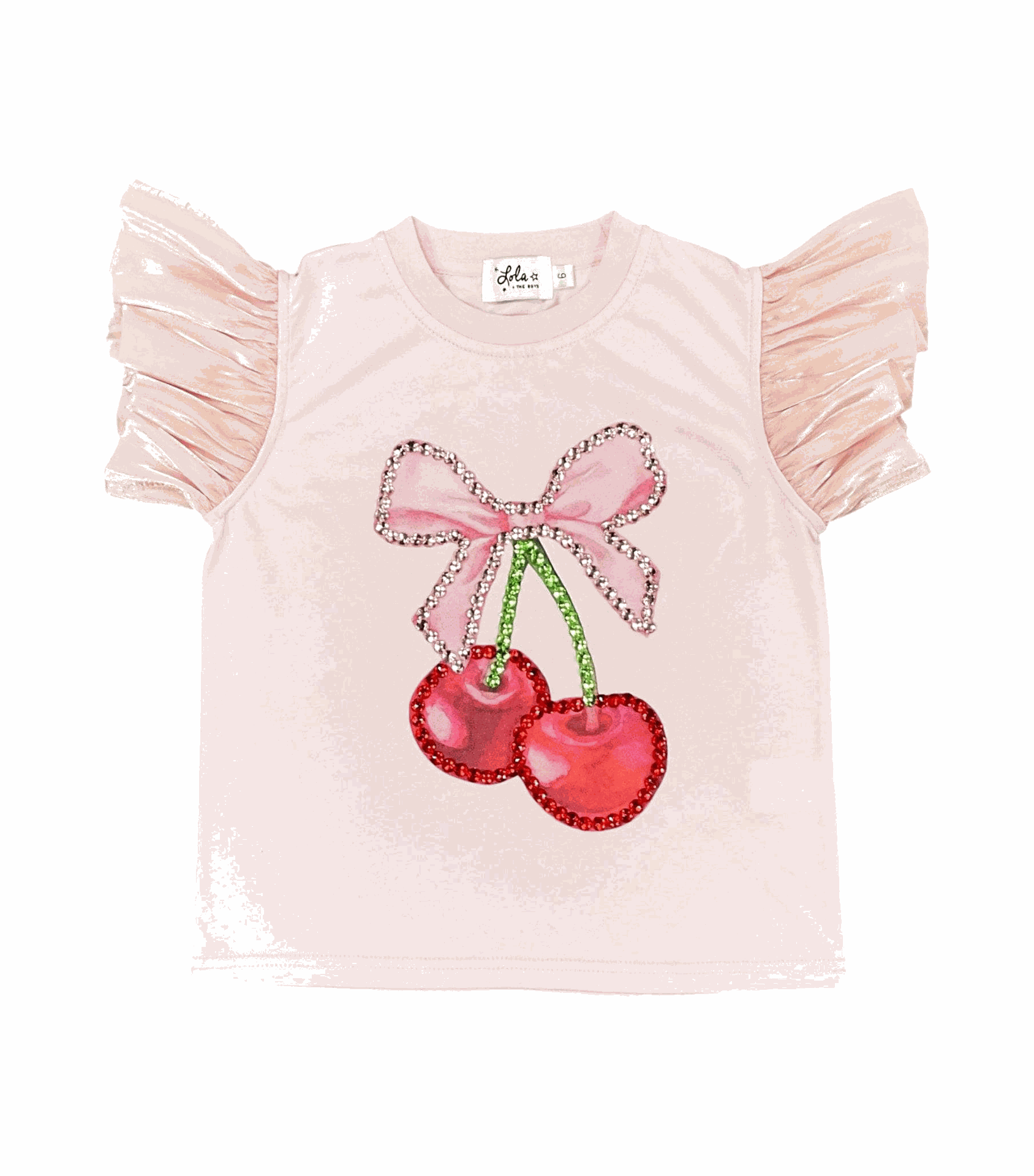 Sweeten your style with this pastel pink T-shirt featuring dazzling crystal cherries and a sparkly bow.