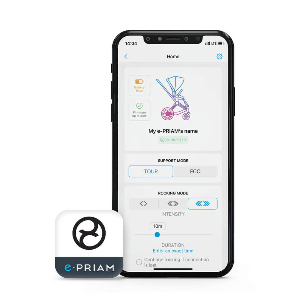 - e-PRIAM APP FEATURES: Rocking Mode - Choose between 3 rocking settings and set the duration to gently soothe your child, Support Modes - Tour Mode provides maximum assistance while Eco mode saves battery power, Battery Status - Monitor the battery level so you always know when to recharge