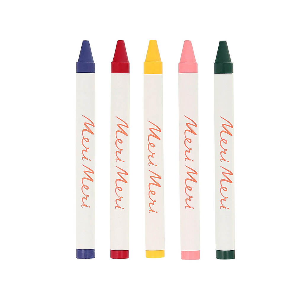 * Contains a set of 5 wax crayons in baby pink, crimson, lemon yellow, cobalt and dark green, with printed protective covers