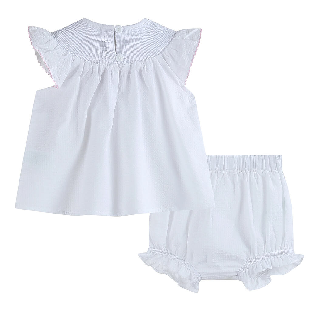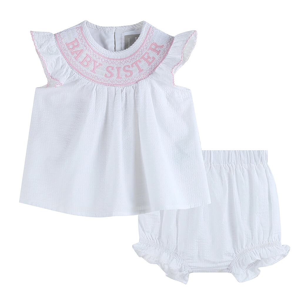 Get ready for sweetness overload with our White Baby Sister Smocked Dress and Bloomer Set! Crafted from gentle 100% cotton, this darling ensemble features a delicately smocked neckline adorned with an embroidered 'Baby Sister' motif, accented with charming pink trim. Perfect for your little princess's everyday adventures
