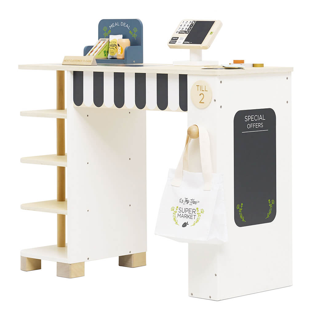 This mini supermarket has everything you could possibly dream of to create the most perfect shopping experience, in the comfort of your own home! It has display shelving, on which play foods can be arranged and comes complete with a meal deal set including a realistic sandwich pack, a refreshing can of drink and a bag of crisps. This promises an authentic shopping experience for all who play with it. In addition, to make the experience even more exciting there is a sleek chalkboard tablet till, conveyor belt, scanner, play money, a 'next customer' sign, special offer chalk board, cotton 'bag for life' and payment, rewards and loyalty cards.