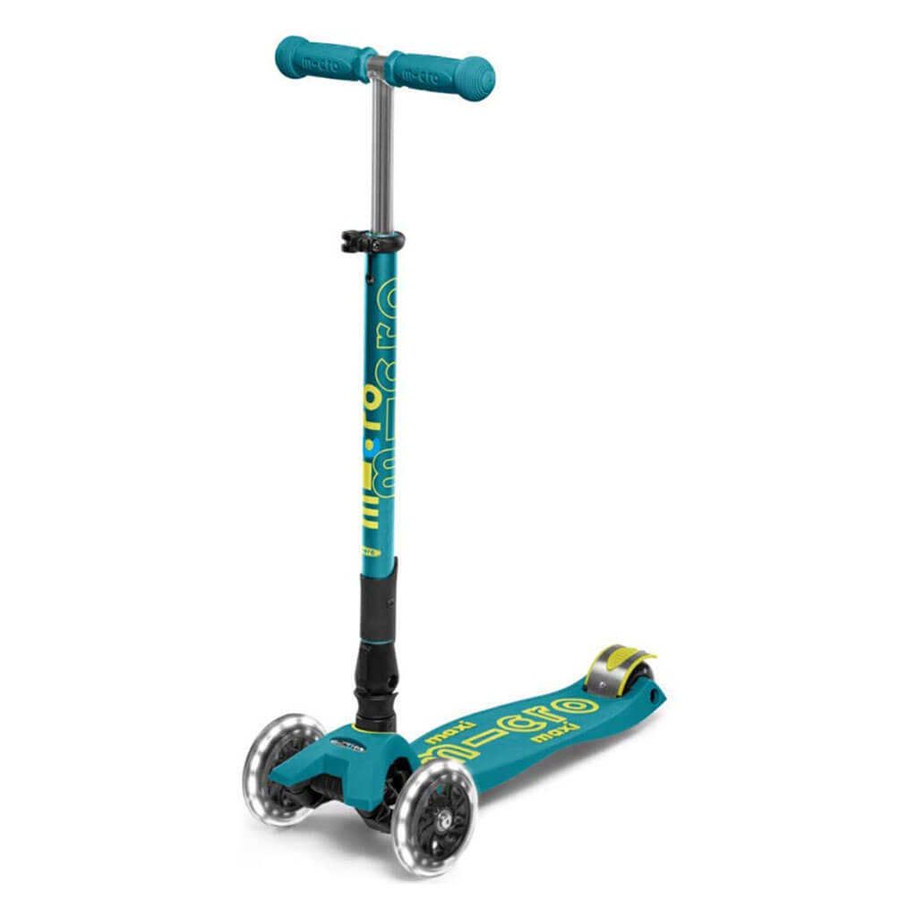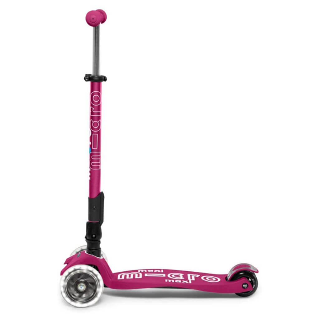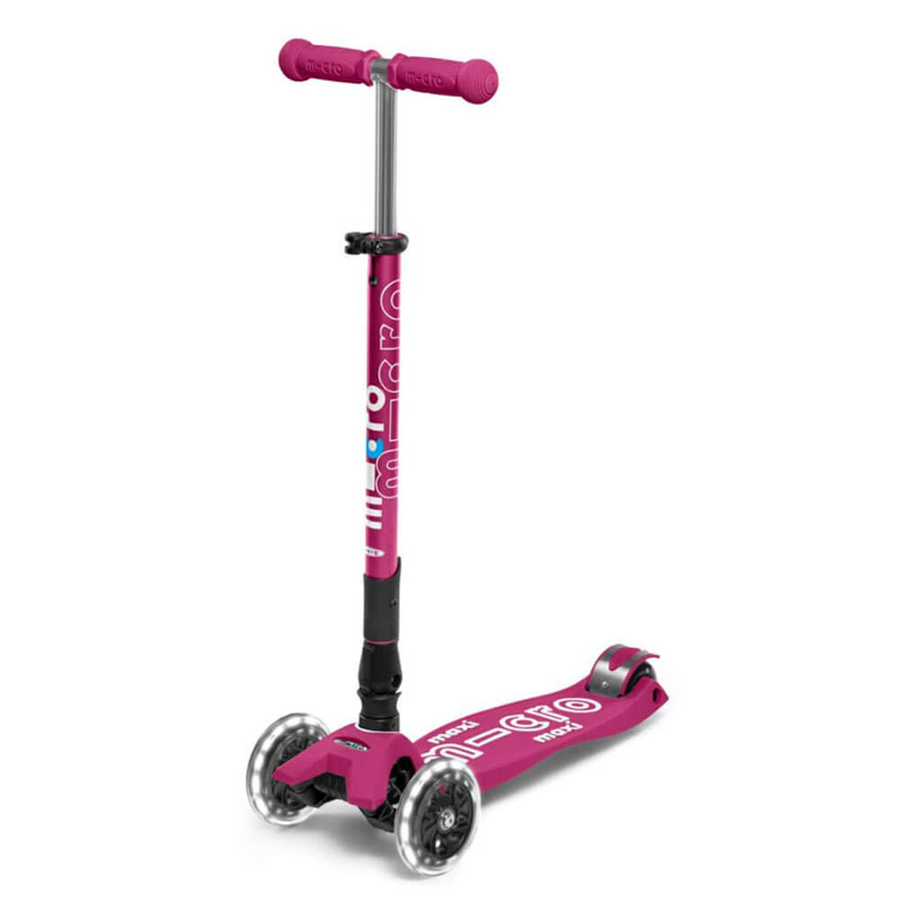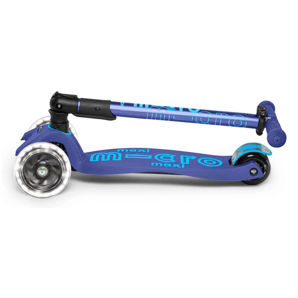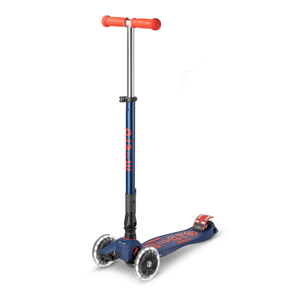 The Maxi Deluxe Foldable LED takes the multi-award-winning, much-revered scooter for ages 5-12 to the next level. This deluxe version has an anodized stem for extra protection against wear and tear, a unique, silicone-injected footplate for improved grip, and an adjustable, easy-folding T-bar, making your travels even more convenient. To fold, simply pull up on the black sleeve located at the base of the T-bar and fold toward the deck. To put upright, use the same motion, lifting the T-bar into a standing position. Impeccable Swiss engineering, thoughtful attention to detail, and innovative design make this scooter The companion bring on every adventure! Easily place in a locker, under a desk, in the trunk, or on public transport. The Maxi Deluxe Foldable LED can go practically anywhere. An original proprietor of the lean-to-steer design, Micro Kickboard have seen it all when it comes to scooter engineering and fully recommends the lean-to-steer method as the safest and most fun way for kids to ride. The T-bar provides stability as children steer by using their body weight to lean right or left. Kids love surfing the sidewalk on their scooters! Safety certified by the CPSC, the Maxi Deluxe Foldable LED is recommended for children up to 110 lbs.