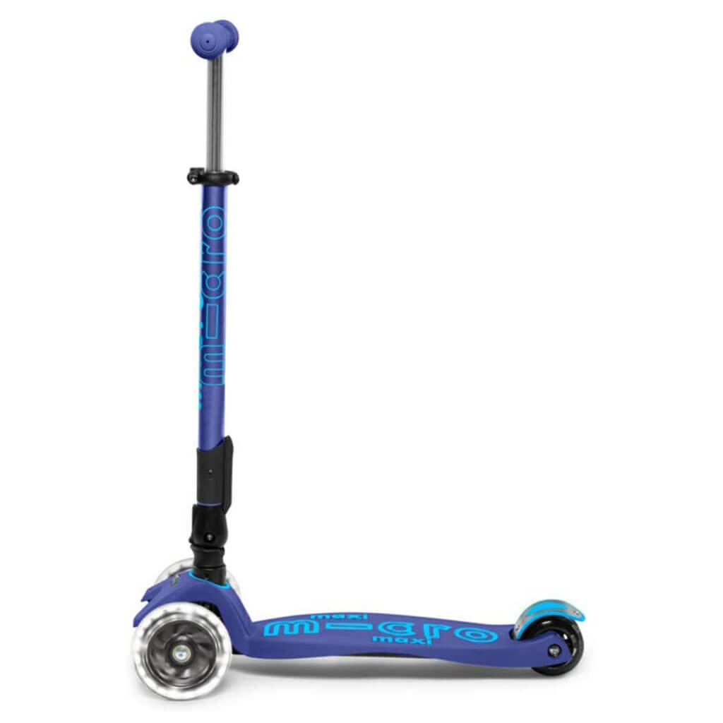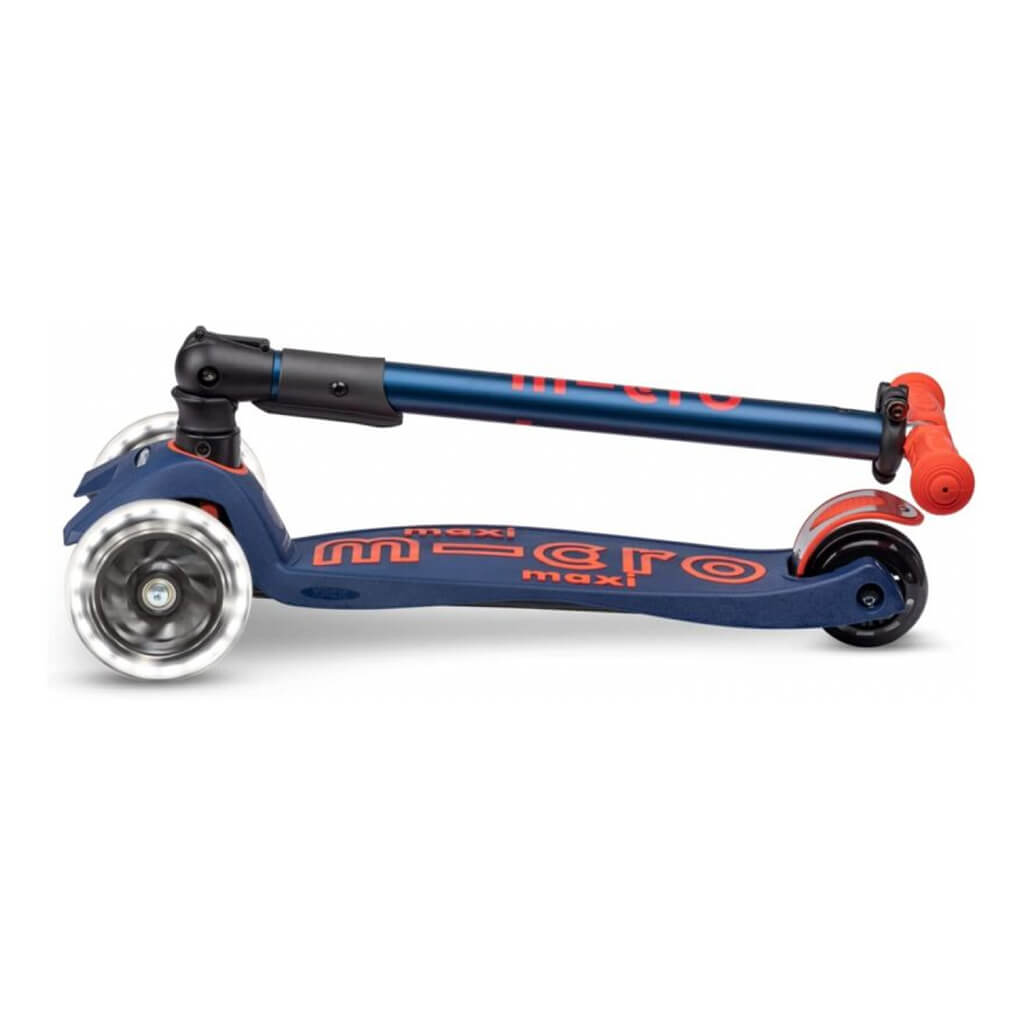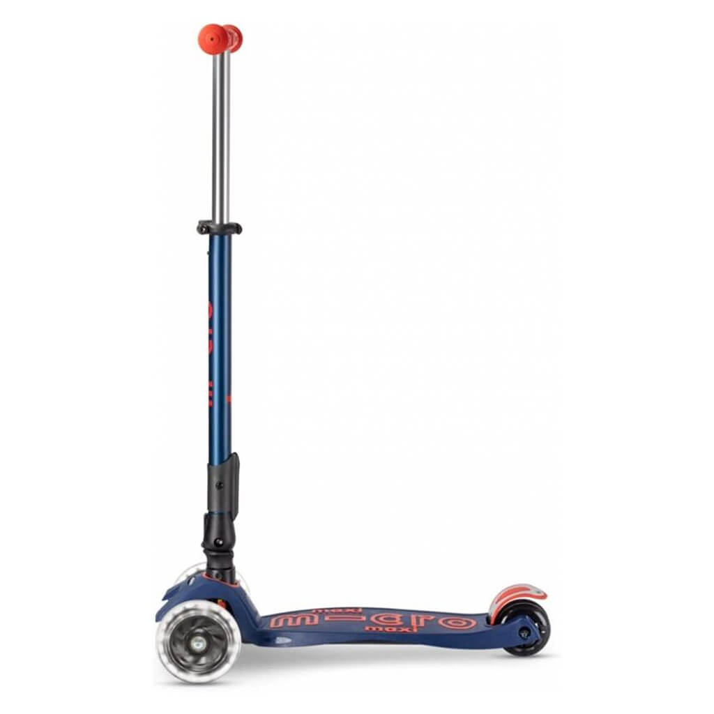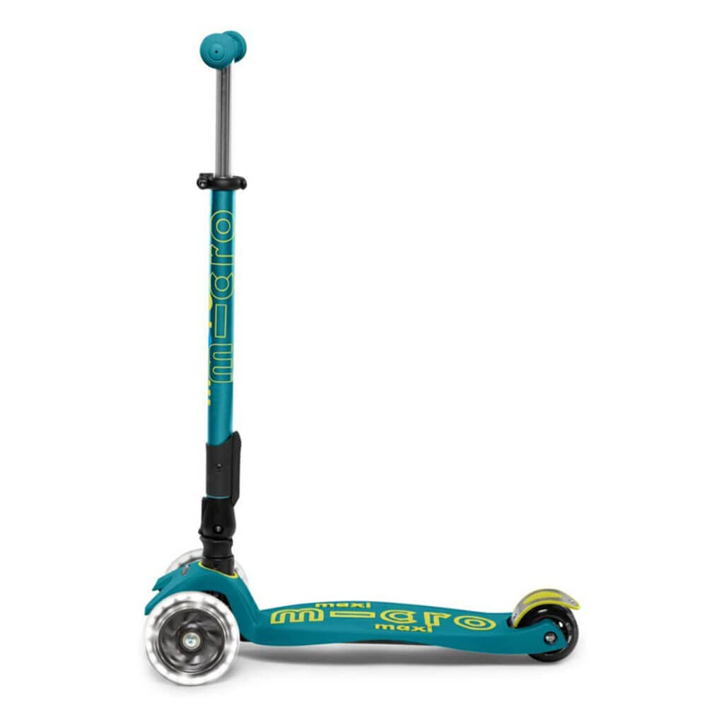 The Maxi Deluxe Foldable LED takes the multi-award-winning, much-revered scooter for ages 5-12 to the next level. This deluxe version has an anodized stem for extra protection against wear and tear, a unique, silicone-injected footplate for improved grip, and an adjustable, easy-folding T-bar, making your travels even more convenient. To fold, simply pull up on the black sleeve located at the base of the T-bar and fold toward the deck. To put upright, use the same motion, lifting the T-bar into a standing position. Impeccable Swiss engineering, thoughtful attention to detail, and innovative design make this scooter The companion bring on every adventure! Easily place in a locker, under a desk, in the trunk, or on public transport. The Maxi Deluxe Foldable LED can go practically anywhere. An original proprietor of the lean-to-steer design, Micro Kickboard have seen it all when it comes to scooter engineering and fully recommends the lean-to-steer method as the safest and most fun way for kids to ride. The T-bar provides stability as children steer by using their body weight to lean right or left. Kids love surfing the sidewalk on their scooters! Safety certified by the CPSC, the Maxi Deluxe Foldable LED is recommended for children up to 110 lbs.