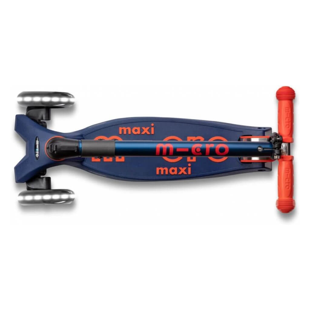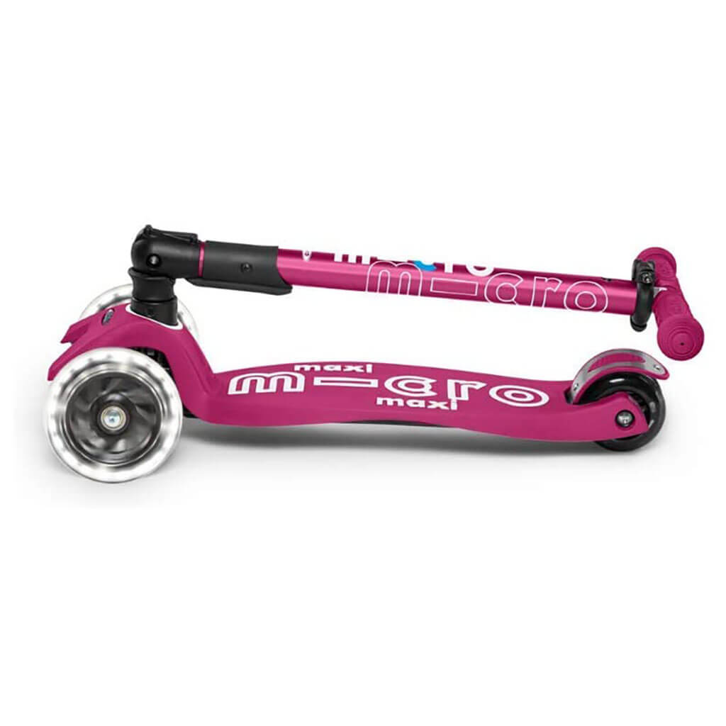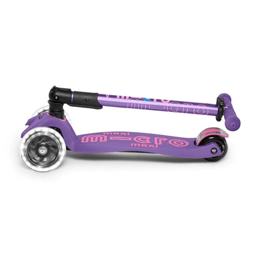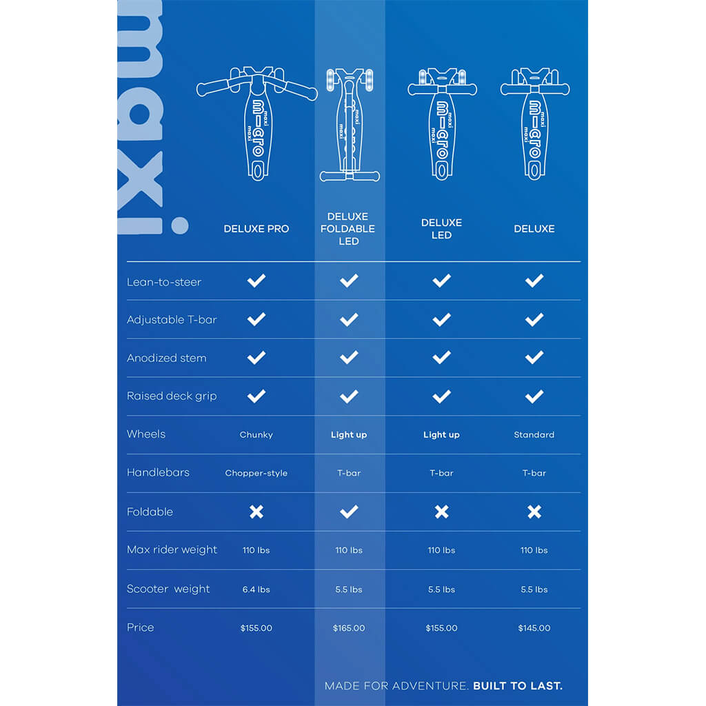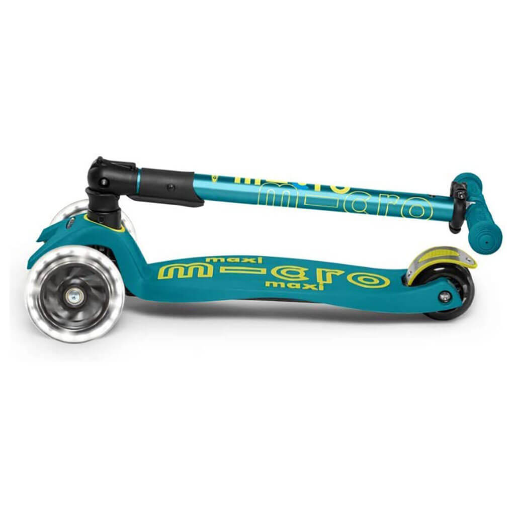 The Maxi Deluxe Foldable LED takes the multi-award-winning, much-revered scooter for ages 5-12 to the next level. This deluxe version has an anodized stem for extra protection against wear and tear, a unique, silicone-injected footplate for improved grip, and an adjustable, easy-folding T-bar, making your travels even more convenient. To fold, simply pull up on the black sleeve located at the base of the T-bar and fold toward the deck. To put upright, use the same motion, lifting the T-bar into a standing position. Impeccable Swiss engineering, thoughtful attention to detail, and innovative design make this scooter The companion bring on every adventure! Easily place in a locker, under a desk, in the trunk, or on public transport. The Maxi Deluxe Foldable LED can go practically anywhere. An original proprietor of the lean-to-steer design, Micro Kickboard have seen it all when it comes to scooter engineering and fully recommends the lean-to-steer method as the safest and most fun way for kids to ride. The T-bar provides stability as children steer by using their body weight to lean right or left. Kids love surfing the sidewalk on their scooters! Safety certified by the CPSC, the Maxi Deluxe Foldable LED is recommended for children up to 110 lbs.
