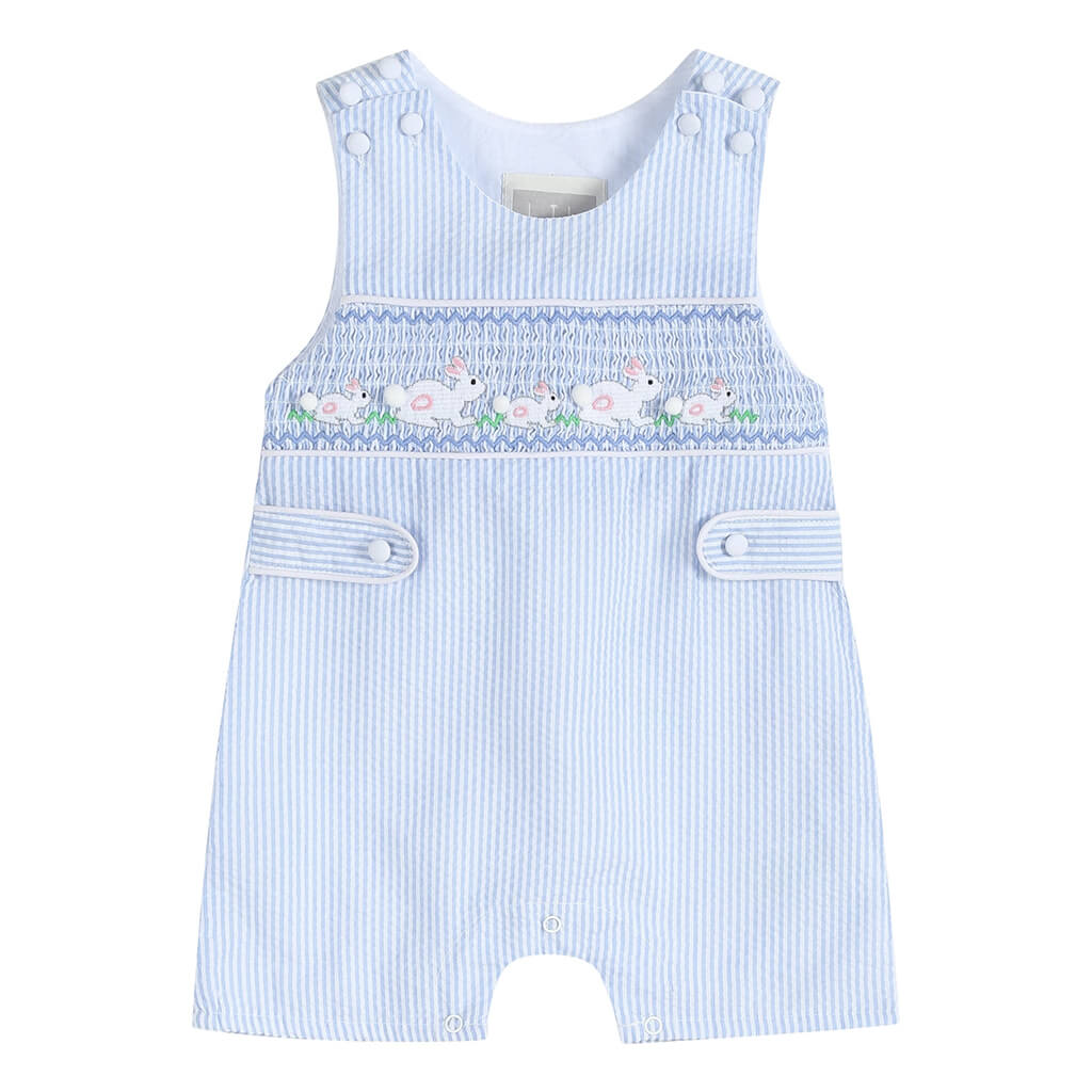 Features a charming bunny embroidery on smocking, coordinating 2-button closure for sizing adjustments and snaps for easy diaper changes.