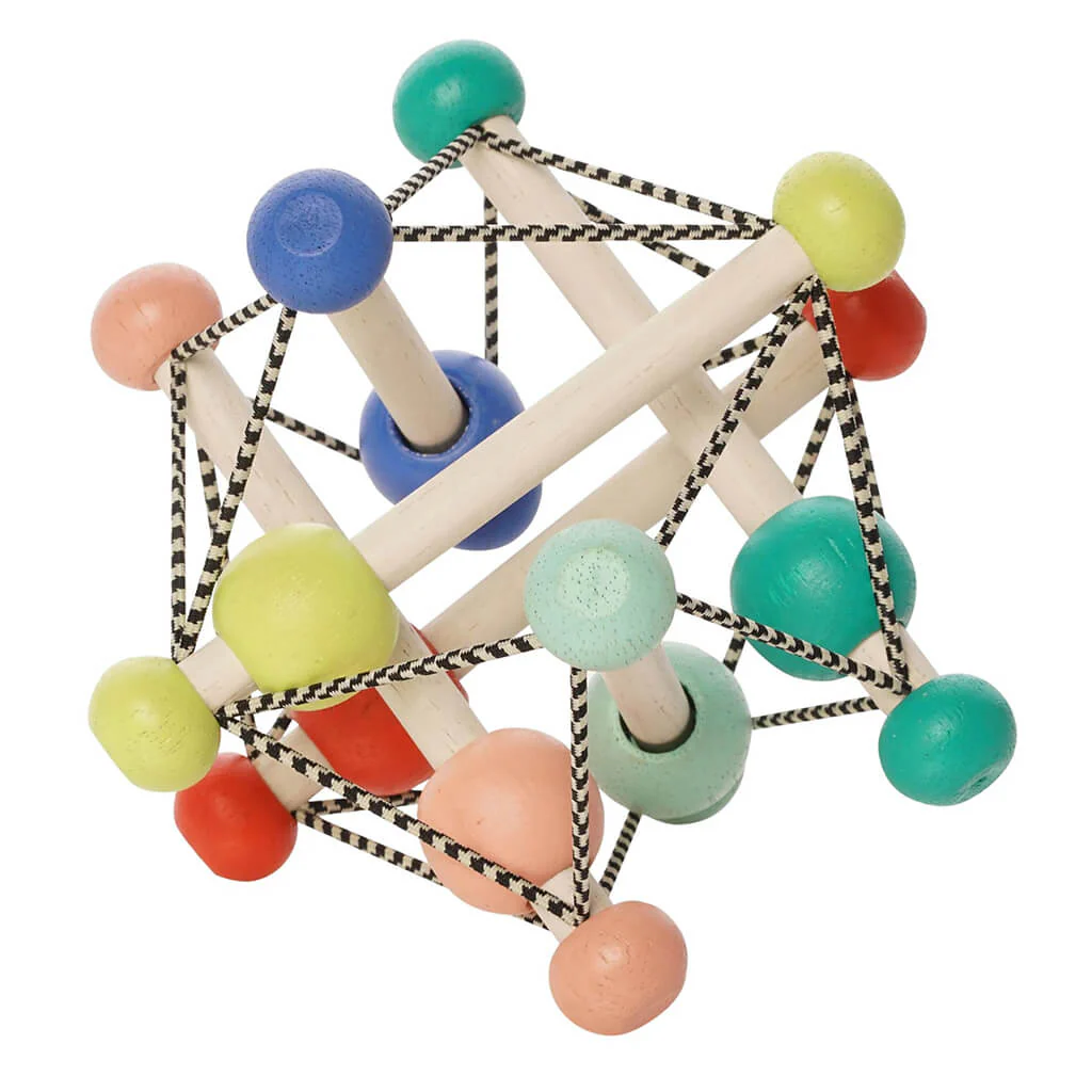 The award-winning Skwish fascinates babies with its twisted web of rods, strings, and beads. Skwishes and returns to its original shape, with beads that slide and rattle. Skwish natural is made from renewable rubberwood.