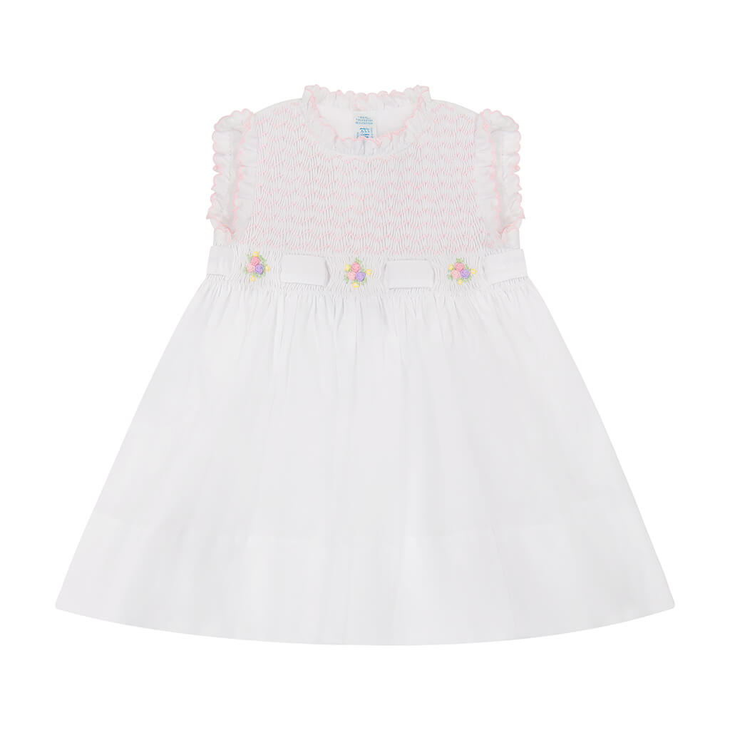 A vintage-inspired dress for your loved one this spring! Handmade details include a chevron-smocked bodice with a scalloped ruffle collar, rosebud bullions, and basket weave ribbon