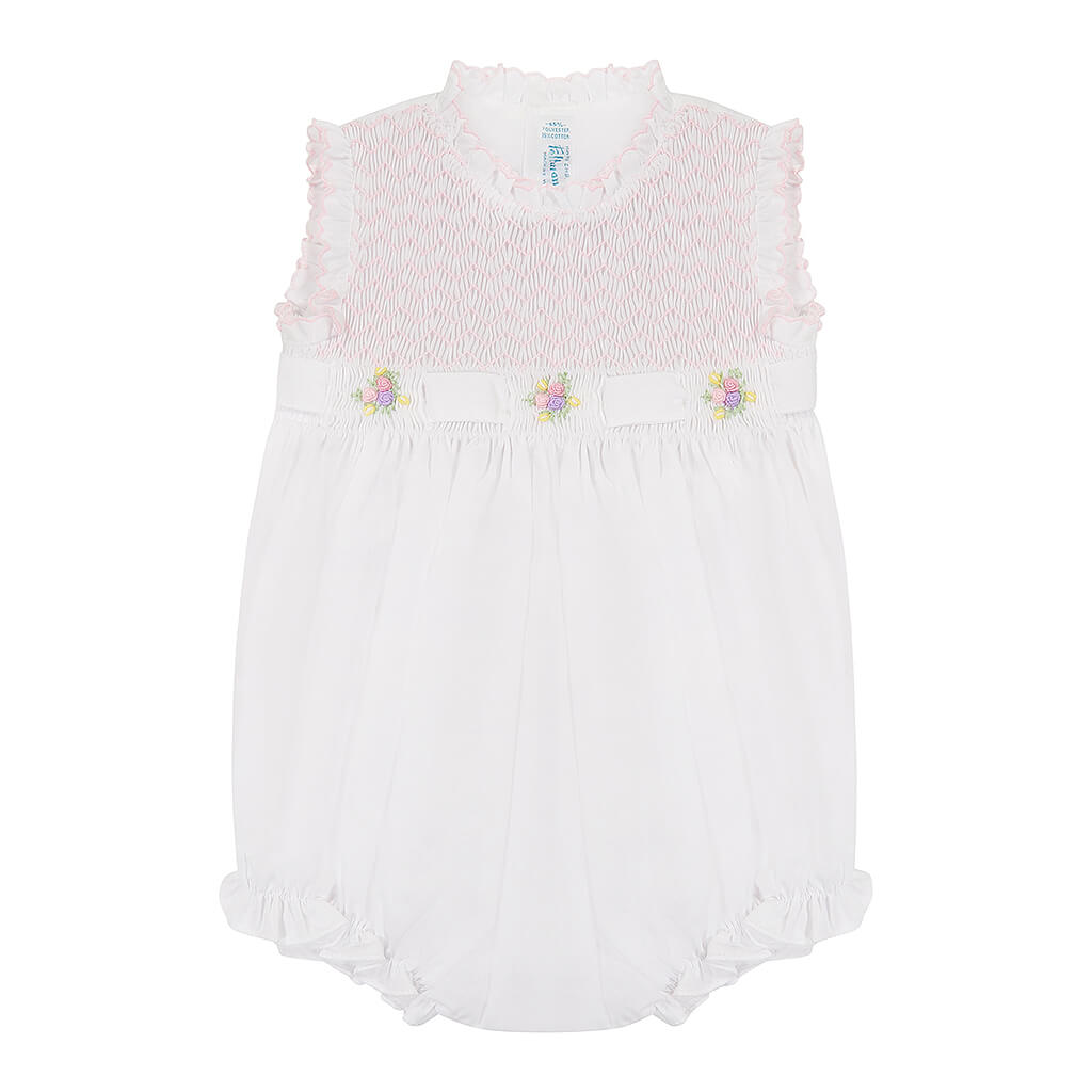 - Features a chevron-smocked bodice with scalloped ruffle trim, rosebud billions, and basket weave ribbon